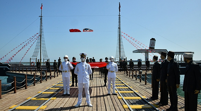 Askerlerin ellerinde karaya çıkarılan Türk bayrağı, milli sporculara teslim edildi. Türk bayrağı milli sporcular tarafından müze gemi Bandırma Vapuru'nda düzenlenen tören alanına götürüldü.