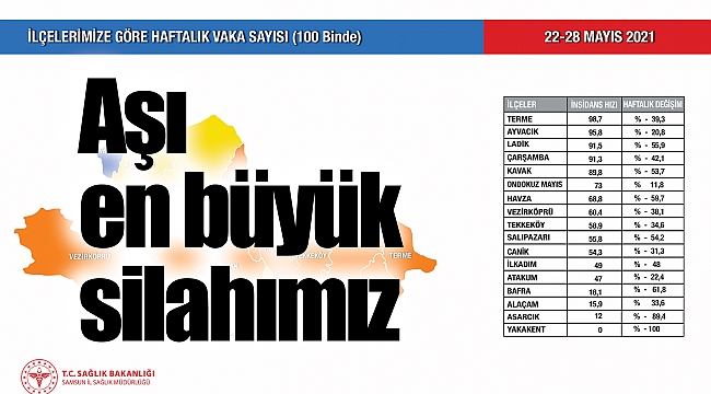 Yakakent'te geçen hafta sıfır vaka görüldüğünü vurgulayan Oruç, "Yakakent ilçemiz, bu özelliğiyle turuncu ilimizin mavi ilçesi oldu, hepimize moral verdi ve bundan da önemlisi ilimizde hiç kırmızı ilçemiz kalmadı. Yakakent ilçemizin mavi olduğu tabloda Alaçam, Bafra ve Asarcık ilçelerimiz sarı olurken, diğer tüm ilçelerimiz turuncu renge büründü. Bu olumlu tablonun olumsuz tarafı ise Terme, Ayvacık, Ladik, Çarşamba ve Kavak ilçelerimizin yüz binde 80'in üzerinde kalan vaka hızlarıyla ilimizin kırmızıya yakın ilçeleri olmaya devam etmesi" değerlendirmesinde bulundu.
