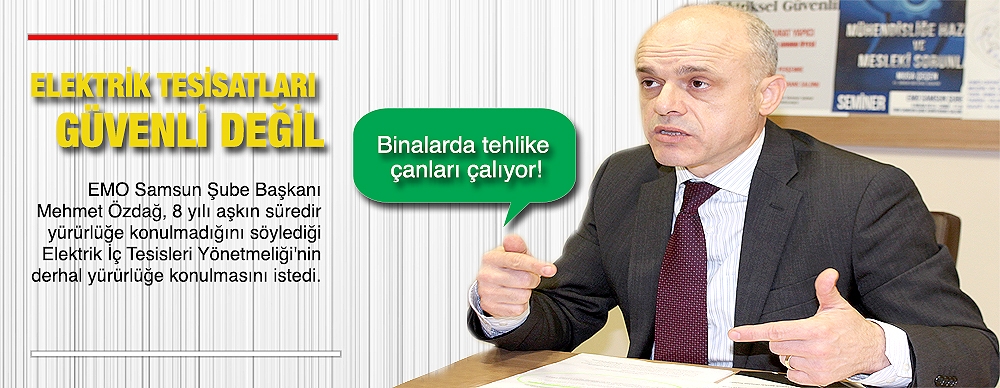 Elektrik Mühendisleri Odası (EMO) Samsun Şube Başkanı Mehmet Özdağ binalarda elektrik tesisatları yüzünden çıkan yangınların oranının her geçen gün arttığına dikkat çekerek, Enerji ve Tabii Kaynaklar Bakanlığı'na 8 yıl önce teslim ettikleri ve halen daha bekletilen Elektrik İç Tesisleri Yönetmeliği'nin yürürlüğe girmesi konusunda bir kez daha uyarıda bulundu.