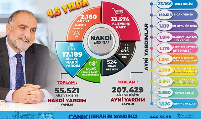 4.5 yıl içerisinde ayni yardımlarla birlikte nakdi yardımların da kesintisiz bir şekilde devam ettiğine işaret eden Başkan İbrahim Sandıkçı, “ Canik’imizde 4.5 yıl içerisinde ayni yardımlarımızla birlikte nakdi yardımlarımızı ara vermeden sürdürdük. 4.5 yılda ihtiyaç sahibi ve dar gelirli 17 bin 189 ailemize nakdi yardım, 2 bin 160 ailemize elektrik faturası, 33 bin 574 adet alışveriş kartı, ilçemizdeki 495 yetim yavrumuza hediye çeki, 524 öğrencimize sınav ücreti desteği sağladık. Nakdi yardımlarımız çerçevesinde bin 576 esnafımıza 500 Türk lirası maddi desteklerinde bulunduk. Sosyal yardım çalışmalarımızı 4.5 yılda olduğu gibi büyük bir hassasiyetle sürdürmeye devam edecek, dar gelirli, ihtiyaç sahibi ve engelli vatandaşlarımızın her zaman yanında olacağız” ifadelerini kullandı.