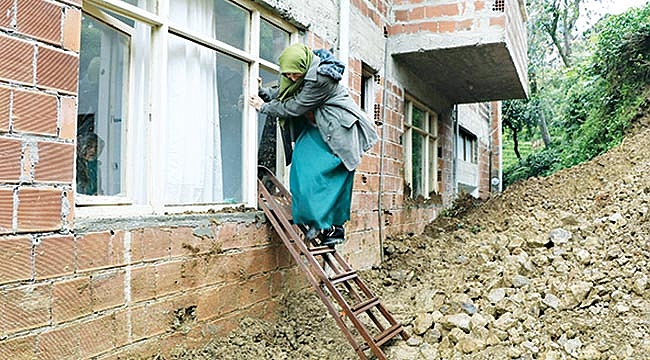 Rize’nin Pazar ilçesinde Kantar ailesi evlerinin kapısına yamaçtan kopan toprak parçalarının kapatması ve evin girişinin yağmur sularıyla dolması nedeniyle evlerine pencereden girip çıkmak zorunda kalıyorlar.