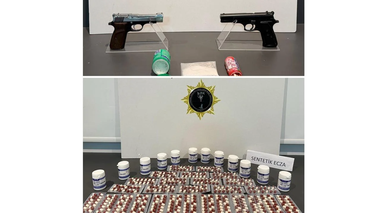 Aramalarda; 1.148 adet sentetik ecza, 64,78 gram metamfetamin, 9,22 gram sentetik kannabinoid, 2 adet uyuşturucu kullanım aparatı, 1 adet hassas terazi, 2 adet ruhsatsız tabanca ve 9 adet tabanca fişeği bulundu.