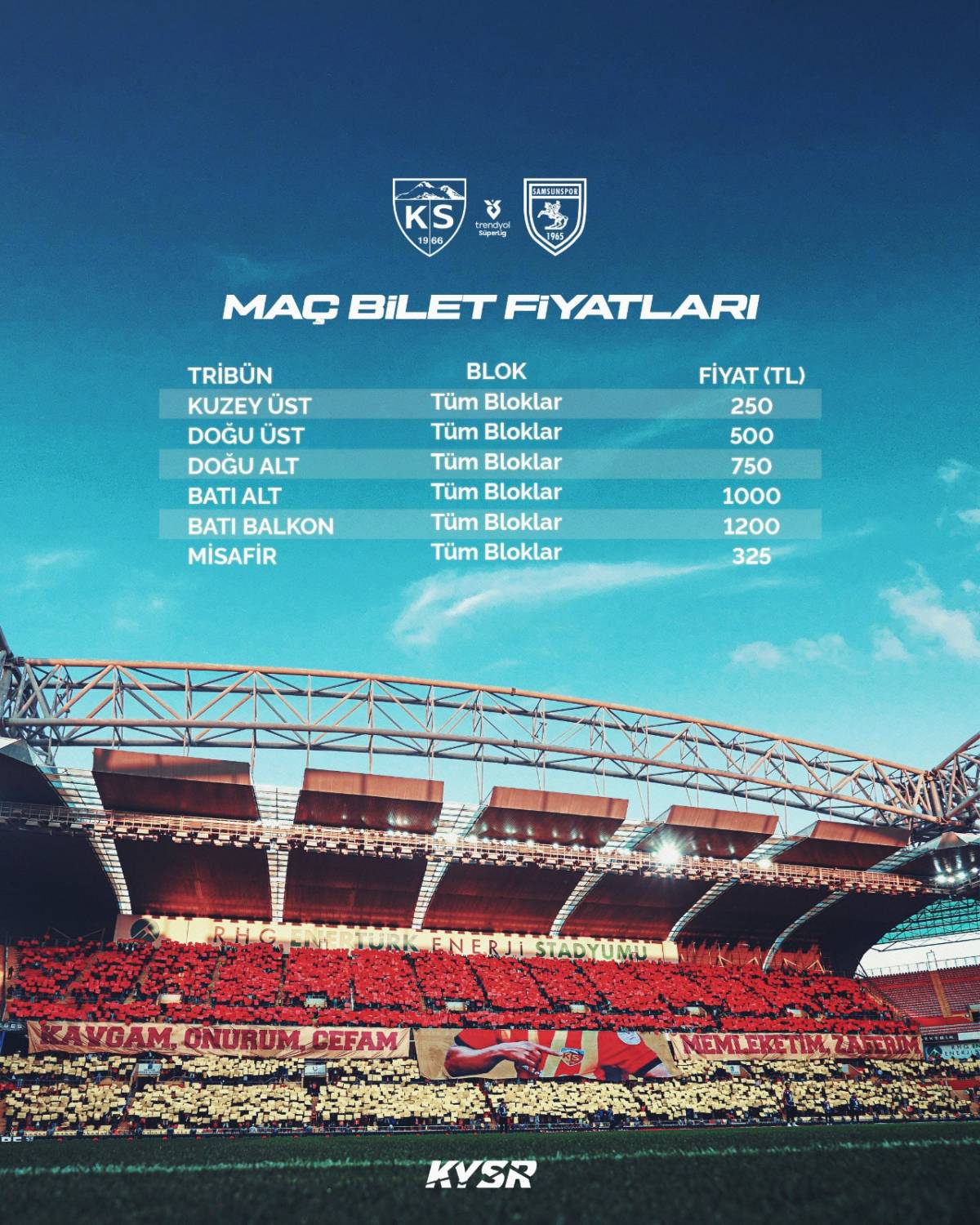 Samsunspor taraftarlarının Kayserispor deplasmanında takımlarını desteklemek için ödeyeceği bilet fiyatı 325 TL olarak duyuruldu. Bu fiyat, misafir takım tribünü için geçerli olacak. Maç biletleri, Passo platformu üzerinden satışa sunulacak. Samsunspor taraftarları, biletlerini kolayca temin etmek için Passo’nun resmi internet sitesi veya mobil uygulamasını kullanabilecek.
