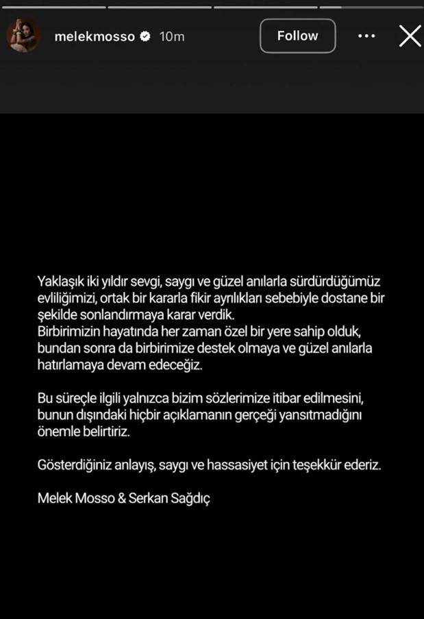 Şarkıcı Melek Mosso, 2023 yılında Serkan Sağdıç'la hayatını birleştirdi. Geçtiğimiz günlerde boşanma iddialarıyla gündeme gelen ünlü çift, 2 yıllık evliliklerini noktaladı.