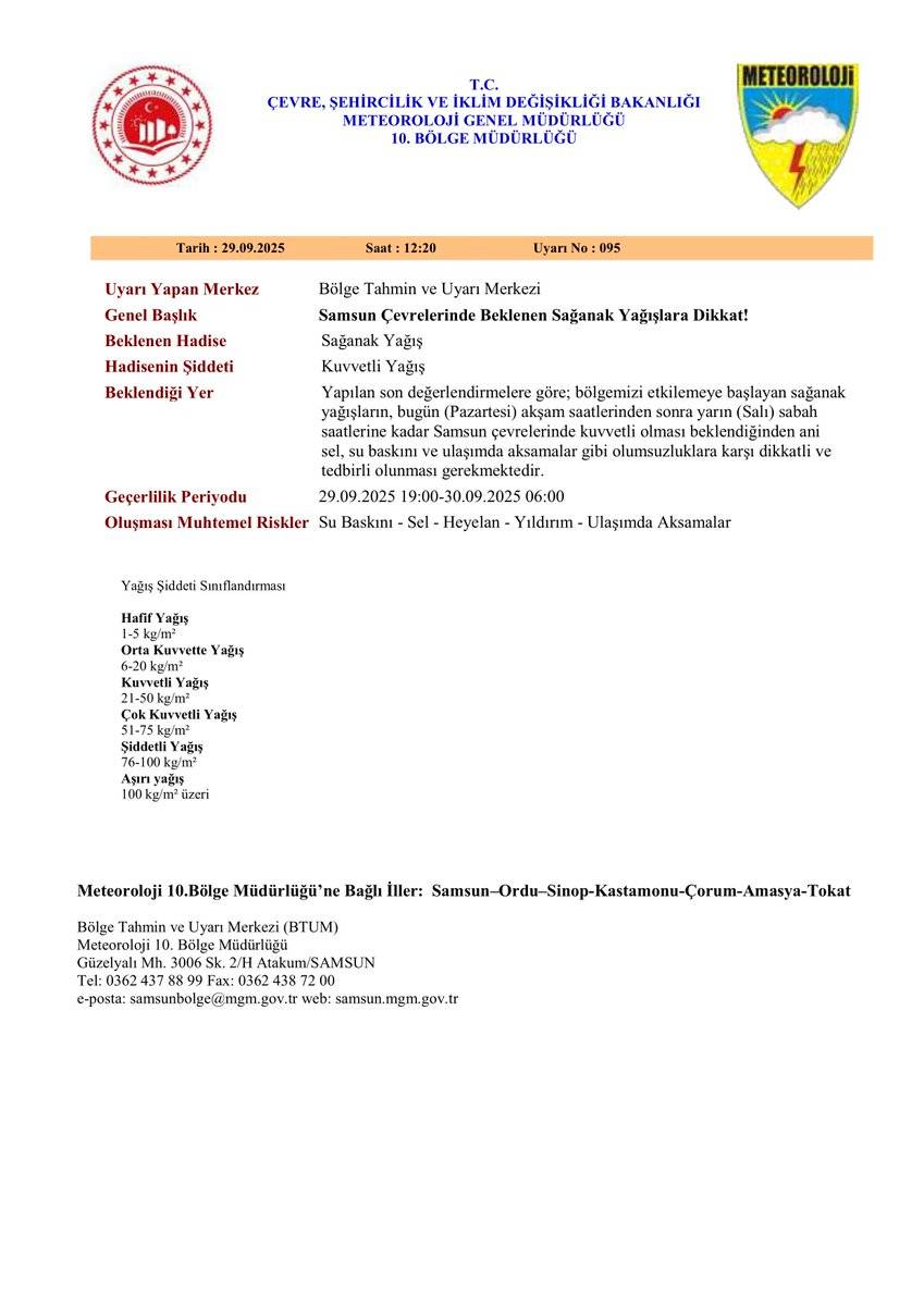 Meteoroloji verilerine göre, Samsun çevrelerinde beklenen yağışların “kuvvetli yağış” (21-50 kg/m²) aralığında olacağı bildirildi.