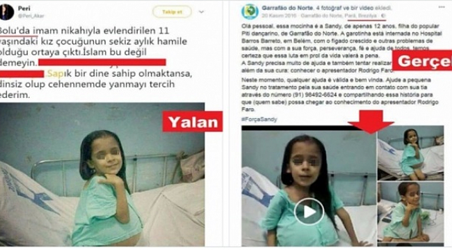 Twitter’da bir kullanıcı “Bolu’da imam nikahıyla evlendirilen 11 yaşındaki kız çocuğunun sekiz aylık hamile olduğu ortaya çıktı. İslam bu değil demeyinSapık bir dine sahip olmaktansa dinsiz olup cehennemde yanmayı tercih ederim” yazdı. İslam’a hakaret eden bu kişinin iddiası tamamen yalandı. Zira kullandığı görsel Brezilya’da karaciğer hastası bir çocuğa aitti.