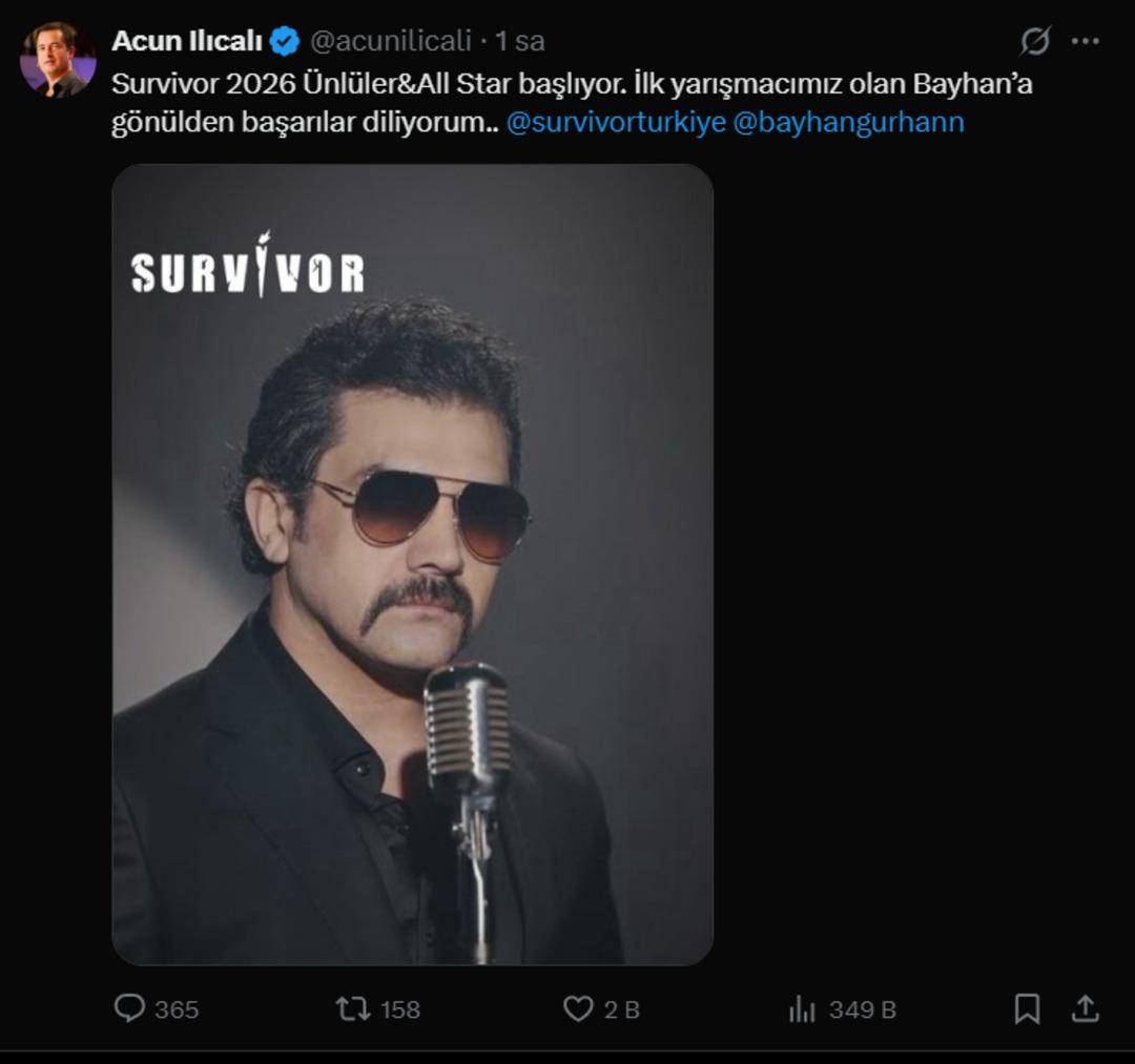 Acun Ilıcalı, 'Survivor 2026 Ünlüler&All Star başlıyor. İlk yarışmacımız olan Bayhan’a gönülden başarılar diliyorum' diyerek ilk yarışmacıyı sosyal medyadan yayınladı. 2003 yılında Kanal D'de yayınlanan Popstar yarışmasında farklı yorumu ve kendine özgü tarzıyla adından söz ettiren Bayhan'ın Survivor'a katılacak olması duyanları şaşırttı.