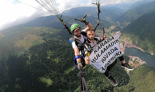 Akbaş, kuzeninin Uzungöl’de turistlere yamaç paraşütü hizmeti verdiğini belirterek “Ben de düşündüm taşındım, benim gibi birçok gencin içinde bulunduğu durumu göstermek ve sesimizi duyurmak için ‘Karada bulamadık, havada arayruk’ pankartı hazırlayarak gökyüzünde bunu açtım. Sosyal medyada da bunu paylaştım. Bu bayağı bir ses getirdi, görüp arayanlar, tebrik edenler oldu” dedi.