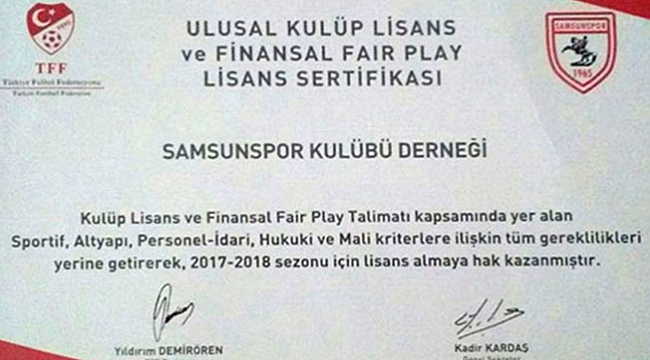 Samsunspor resmi internet sitesinden yapılan duyuruda ise, “Kulübümüz Kulüp Lisans ve Finansal Fair-Play kapsamında yer alan 5 muhtelif kriterin gerektirdiği normları yerine getirmiş ve buna ilişkin Türkiye Futbol Federasyonunca da 2017-2018 sezonu için lisans sertifikası almaya hak kazanmıştır" denildi.