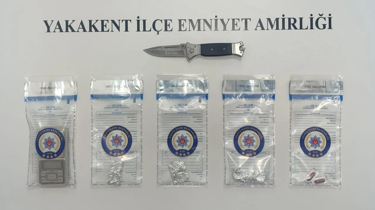 Yapılan aramalarda 3 parça halinde toplam 6,2 gram metamfetamin, 1 adet hassas terazi, 2 adet sentetik ecza ile 1 adet amaç dışı bıçak ele geçirildi.