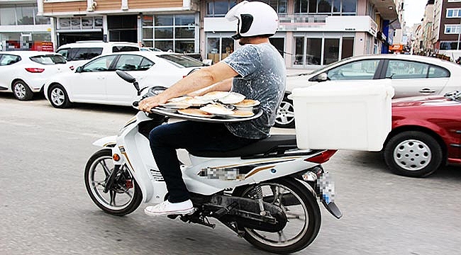 Samsun'da bir elinde yaklaşık 15 tabak yemeğin olduğu tepsiyi tutan, diğer eliyle de motosikleti süren kuryeyi trafikte görenler gözlerine inanamadı.